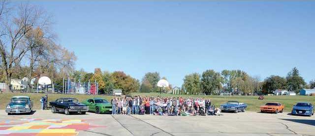Platteville Middle School eighth-graders read S.E. Hinton’s The Outsiders each year, culminating with a day in which students and teachers dress as Socs or Greasers. The class photo this year included classic cars ranging from a 1955 Packard to a new Dodge Charger.
