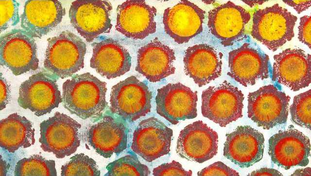 Pete Daniels works in acrylics. He likes to work conceptually while exploring the abstract and surreal. One of his pieces explores the repeating hexagons in the sculpture of the community of bees in their hives. His art has recently been in a solo show at Organic Valley and on display at the Viroqua Food Coop.