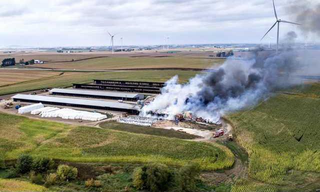 FIRE IN HIGH WINDS with large amounts of black smoke were seen at the Katzman Farms, Inc. open barn set up on Highway 81 in Seymour Township. The fire happened Tuesday, Oct. 3 at 12 noon. Seven fire departments were called to respond on mutual aide to fight the blaze. 750,000 gallons of water was used at the fire.