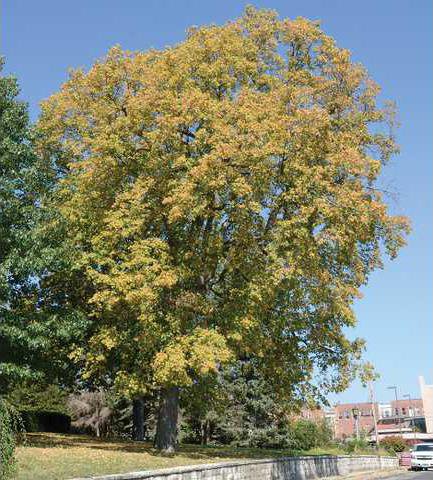 Two trees within sight of each other south of downtown Platteville are between the brilliant blue sky and the green grass.
