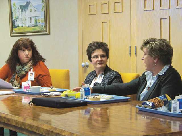 As part of her visit to Hillsboro Nov. 4 to hold in-district office hours and discuss community members’ concerns with state government, state Sen. Jennifer Shilling (D-La Crosse, right) visited Gundersen-St. Joseph’s Hospital and Clinics from 12-12:45 p.m. to discuss and answer staff members’ questions on health care and other subjects in the hospital’s board room. Left-right: Deb Arndt, Deb Smith, Shilling.