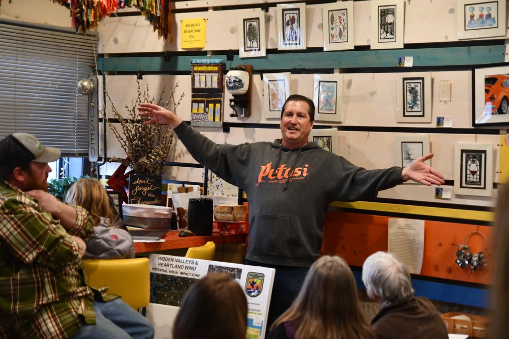The meeting, organized by Lemon Door owner Melodie Betts, was led by Mount Hope resident Pete Moris, who has been active in opposition to wind energy projects in Grant County and other neighboring areas.