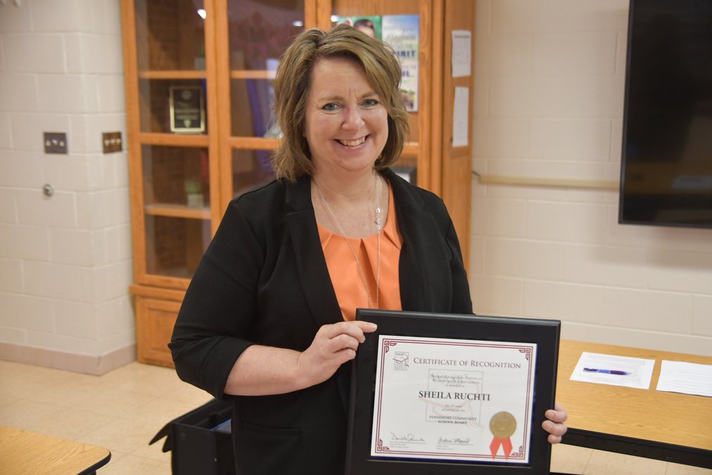 Fennimore Community School Board member Sheila Ruchti was honored for her 20 years of board member service at the board’s monthly meeting held on Wednesday, April 15.