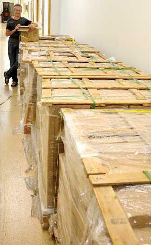 Platteville photographer Mark Hirsch is pictured with several thousand copies of That Tree, the book of his year-long project of taking a photo of a Town of Platteville burr oak tree with his iPhone. The books and prints are available to order at www.thattree.net.