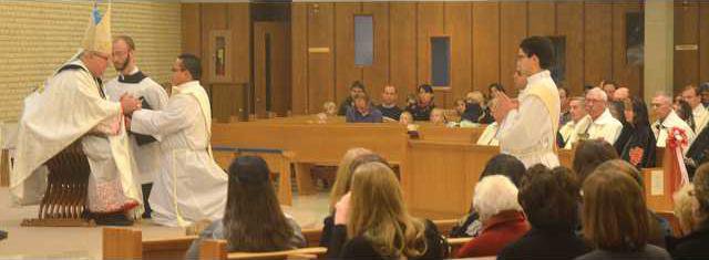 Felipe Andrés Alvial, Vicente Oswaldo Salas Hinojosa, and Jerry Onofre Zhañay Rivera became priests in the Society of Jesus Christ the Priest at St. Mary Catholic Church Monday night.