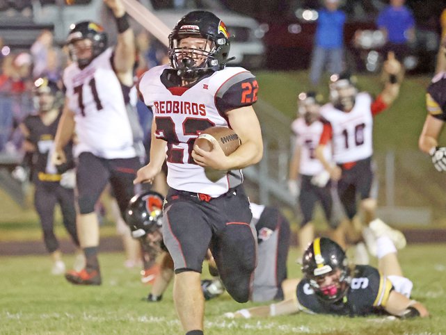 Darlington sophomore Breylin Goebel ran 23 times for 184 yards and three touchdowns (4, 8 and 20 yards) as the Division 6 #6 Redbirds downed the D6 #8 Cuba City Cubans 53–33 in Cuba City last Friday night. After Goebel put the ‘Birds ahead 8-0 with an early 4-yard TD run and conversion run, senior quarterback Beau Kopp connected on TD passes of 24 yards to senior wideout Carter Olson and 39 yards to senior running back Chayse Barth to thrust the Cubans into the lead at 14-8. Darlington pulled back in front in the closing seconds of the opening stanza on an 8-yard TD run by Goebel and Evenstad’s first successful conversion, and then extended the lead to 32-21 by the halftime break on TD runs by Horne (1) and Goebel (20) in the second quarter.
