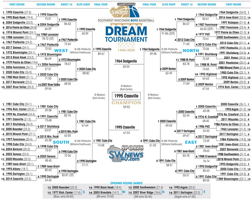 NOTE: The Final Four and Championship results of the SWNews4U.com SW Wisconsin Boys Dream Tournament were published in the Grant County Herald Independent, The Platteville Journal, Fennimore Times, Republican Journal, Tri-County Press and the Richland Observer June 10-11. The Boys All-Dream Tournament Team will be published in the same area newspapers June 17-18.