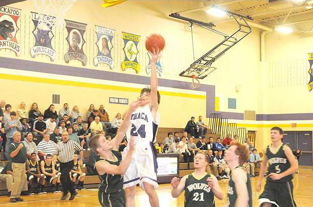 Ithaca, which hit 10 of 16 from beyond the arc, jumped out to an 8-0 as Huffar and Koch booked threes. Ithaca stretched its early lead to 13-4 and held a 15-8 lead after one quarter before foul trouble allowed the Wolves to stage a comeback. Hitting six of 10 free throws in the second quarter, W-C tied the game, 21-21, and then took the lead when Olson scored.